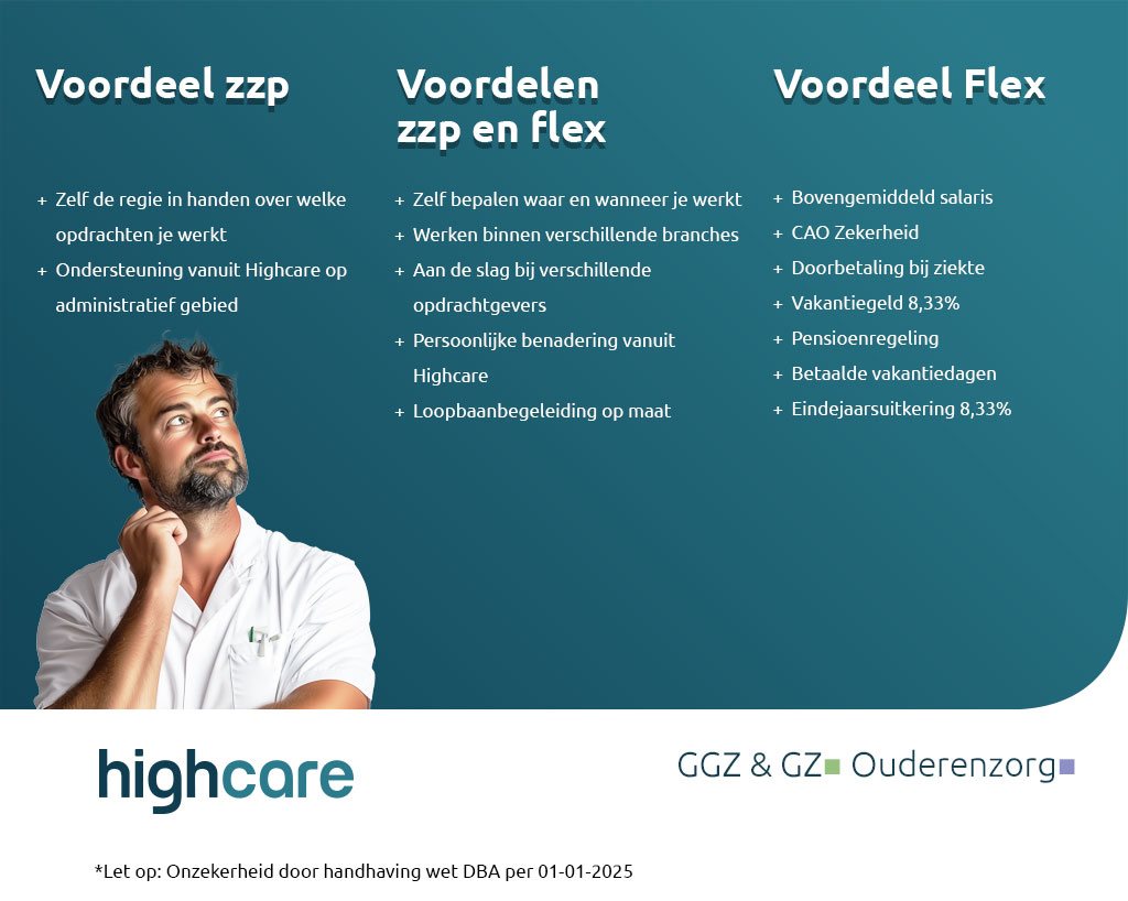 Wij begrijpen dat deze ontwikkelingen veel vragen oproepen en wellicht onzekerheid. Twijfel jij bijvoorbeeld of het zzp-schap nog bij jou past? Ga met ons vrijblijvend in gesprek. Via Highcare is het ook mogelijk om als uitzendkracht (flex) aan het werk te gaan. Zie hieronder de verschillen tussen zzp en flex.